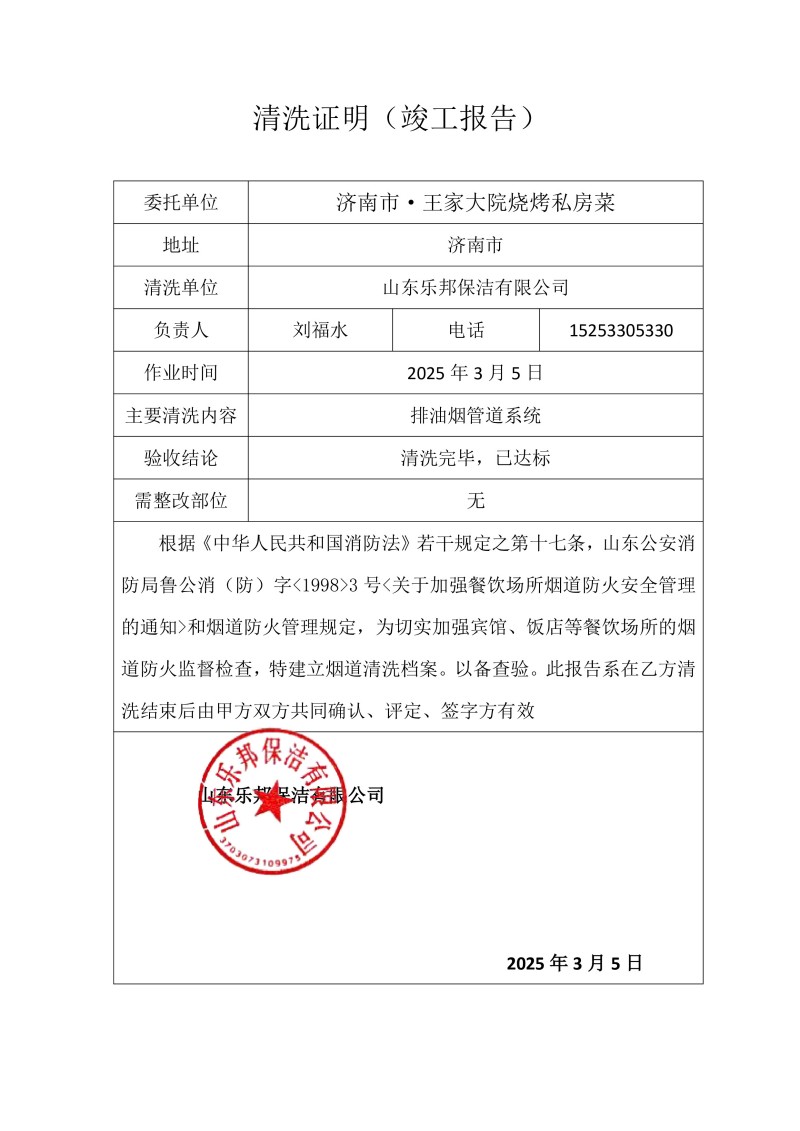 濟南市·王家大院燒烤私房菜清洗報告25.3.5