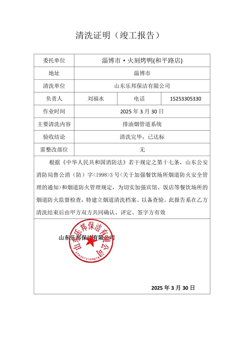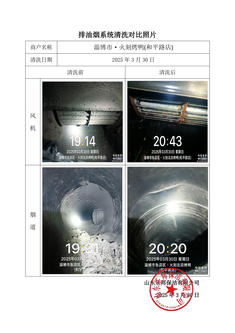 淄博市·火刻烤鴨(和平路店)清洗報(bào)告25.3.30