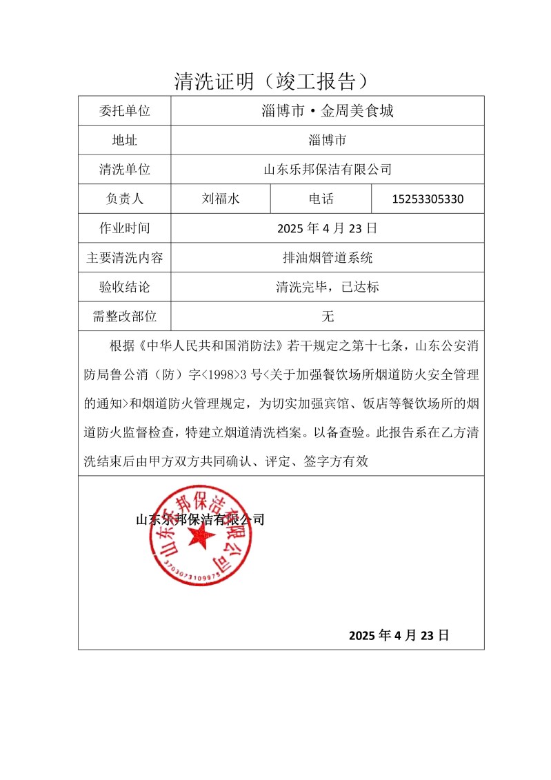 淄博市·火刻烤鴨(和平路店)清洗報告25.3.30