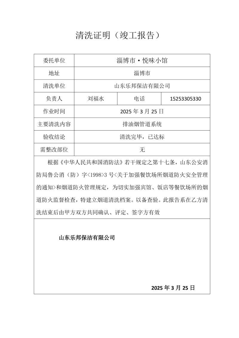 淄博市·知味鮮海鮮家常菜清洗報告25.3.23